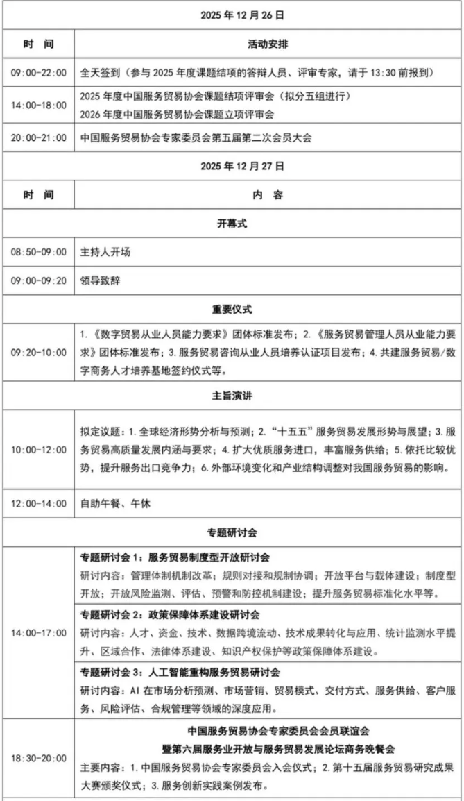 2025年是“十四五”收官、“十五五”谋篇布局之年。第六届服务业开放与服务贸易发展论坛暨服务贸易高质量发展论坛拟于2025年12月26-28日在天津举办,旨在为“十五五”服务贸易发展开篇谋局提供建设性意见和建议,助推服务贸易高质量发展。